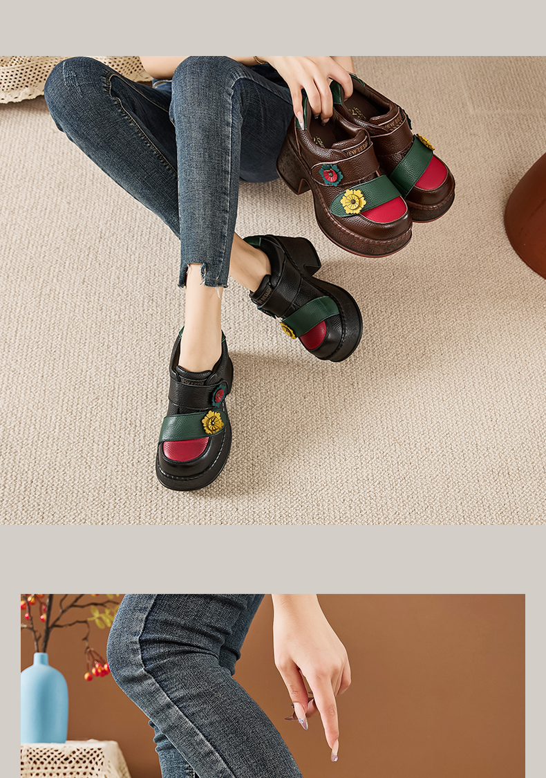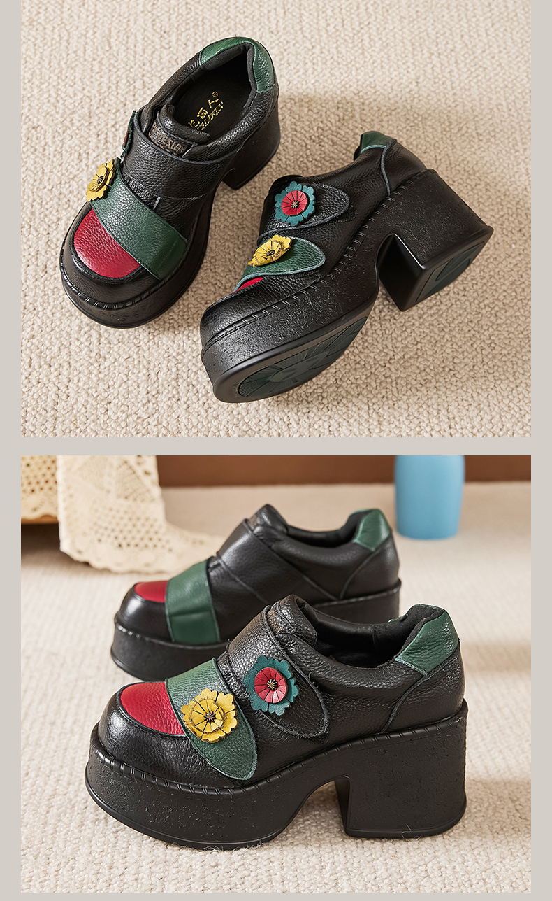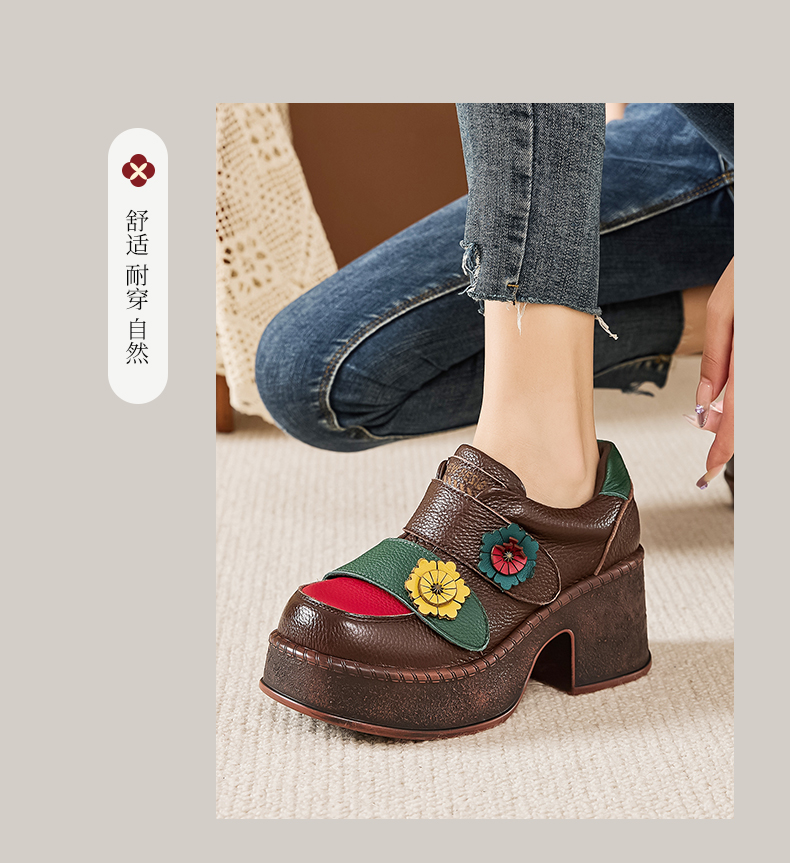 嫔妃丽人头层牛皮民族风手工原创复古花朵女单鞋高粗跟真皮女鞋新款学生鞋7690(三片叶)(286)