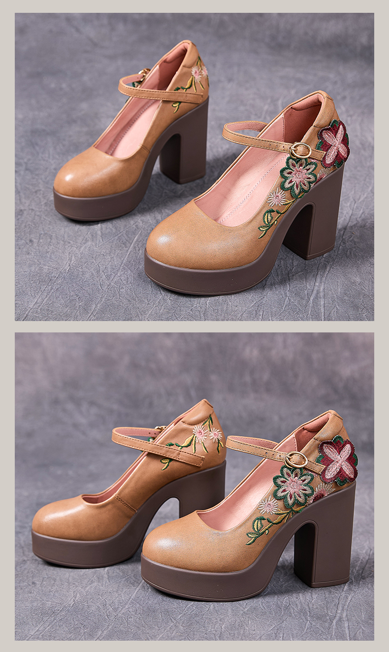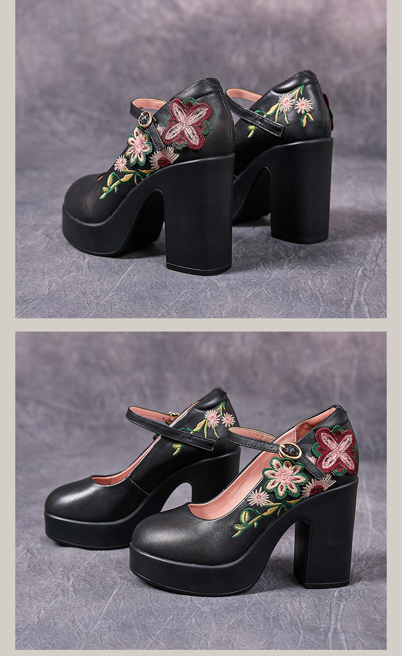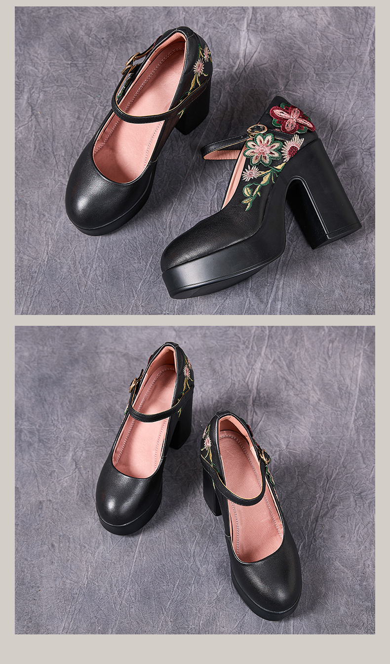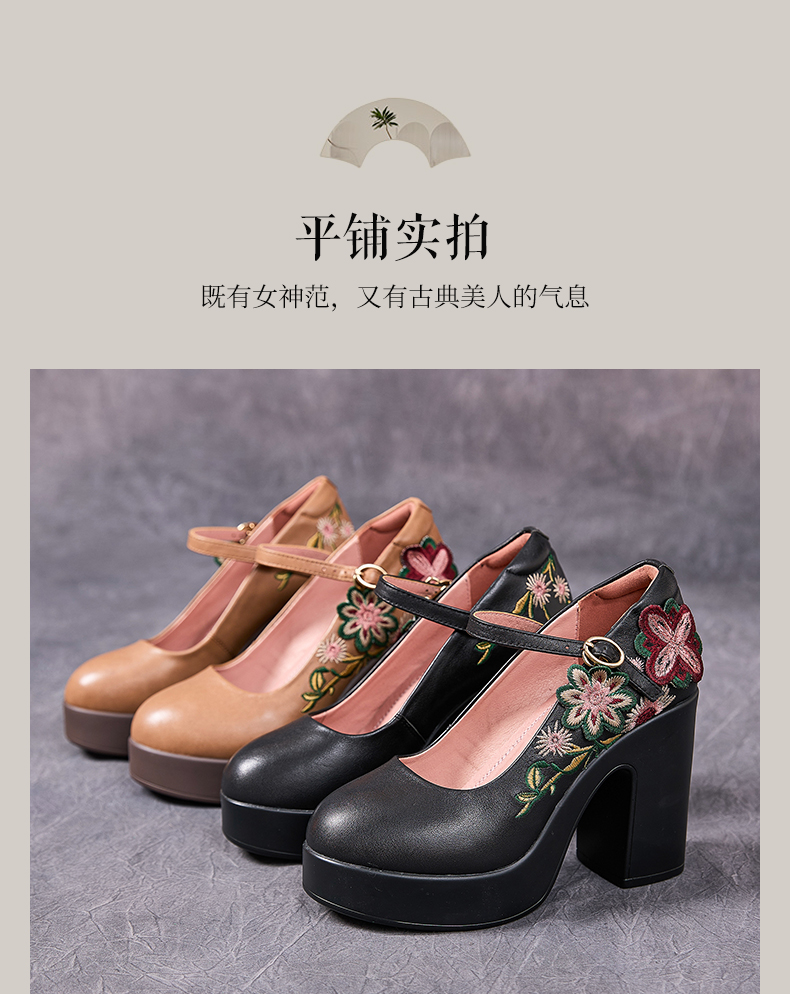 7011嫔妃丽人头层牛皮新中式粗跟厚底百搭学院风包头花朵一字带小单鞋(云纹单鞋)